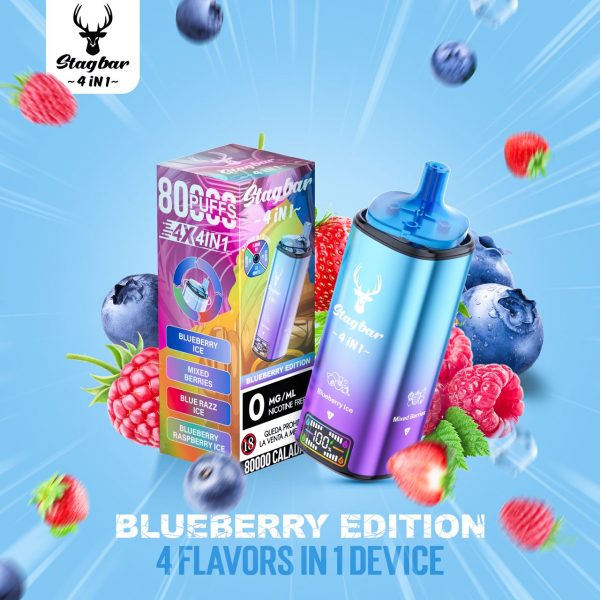 El Stagbar 4 en 1 Blueberry Edition redefine el concepto de vape desechable. Disfruta de una experiencia de vapeo intensa, duradera y libre de nicotina, con hasta 80.000 caladas de puro sabor afrutado.