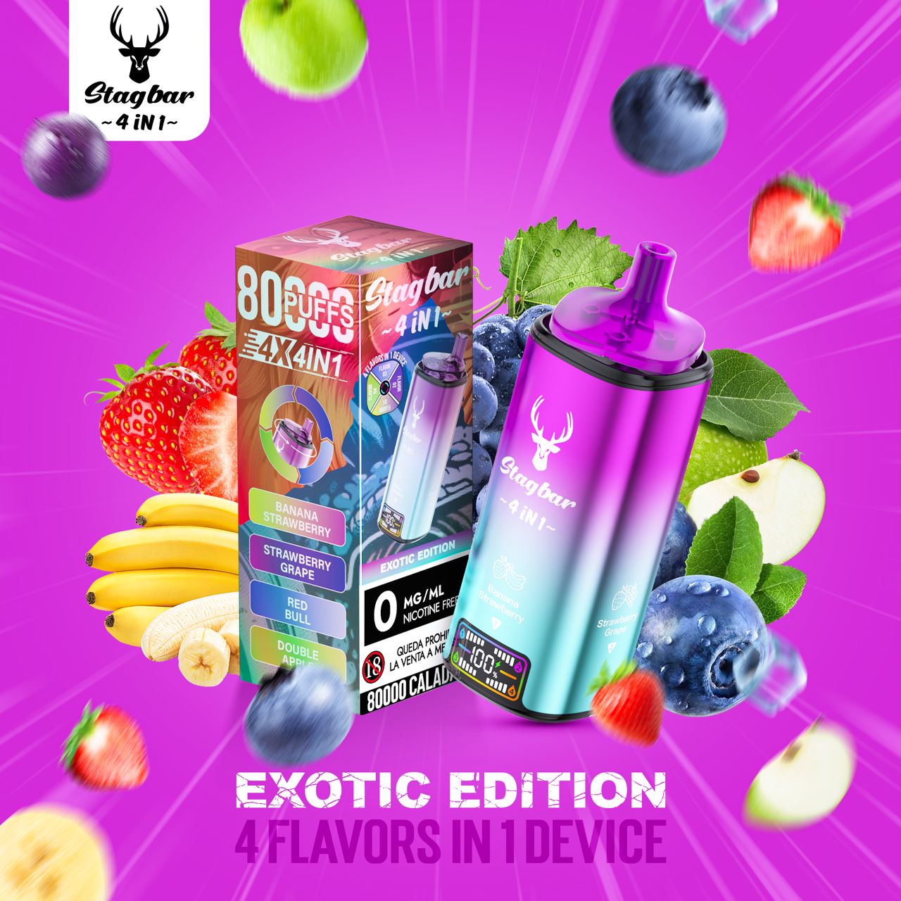 Atrévete a descubrir sabores fuera de lo común con el Stagbar 4 en 1 Exotic Edition, el vape desechable que combina potencia, duración y un sabor tropical incomparable. Con hasta 80.000 caladas y cero nicotina, disfrutarás de una experiencia de vapeo suave, intensa y sin límites.